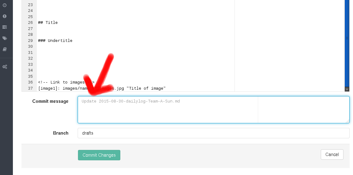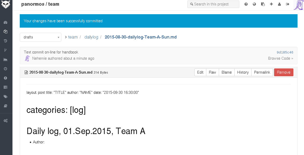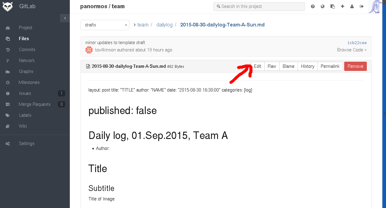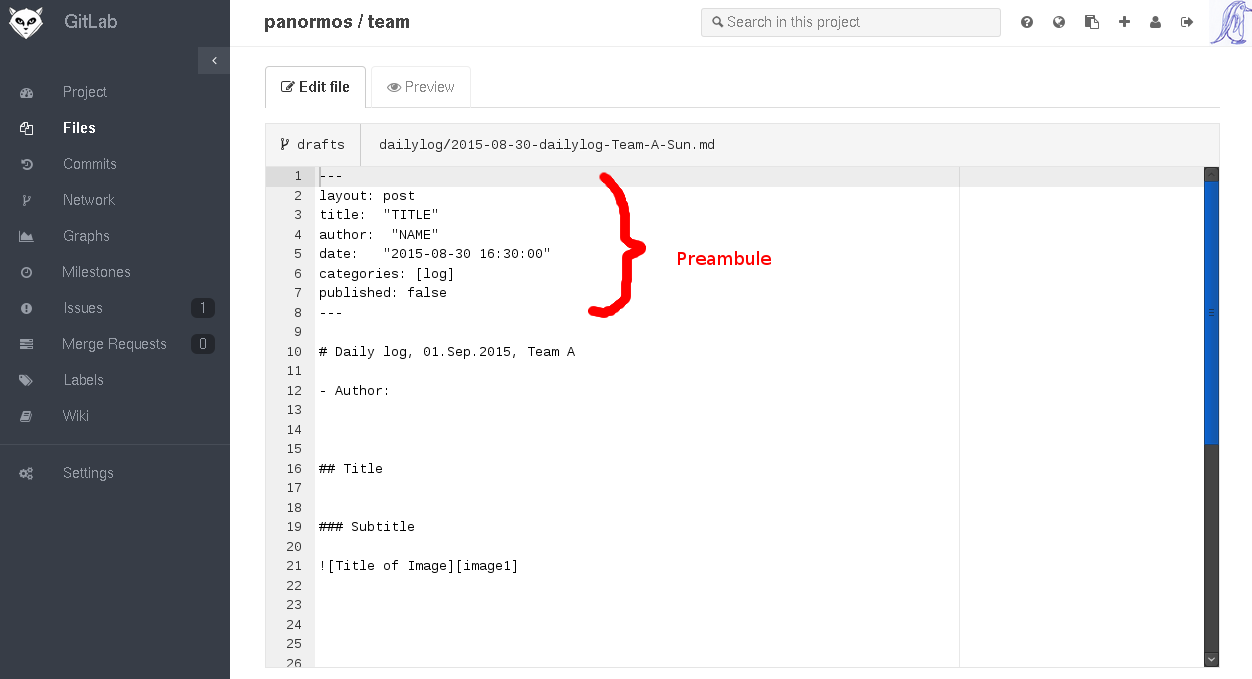 YYYY-MM-DD-dailylog-Team-X-Ddd.mdfor example for a virtual log from Team A on Sunday the 30th August 2015, the name will be2015-08-30-dailylog-Team-A-Sun. Just click on it! If your file is missing, ask Toby or Néhémie. They may have forgotten!