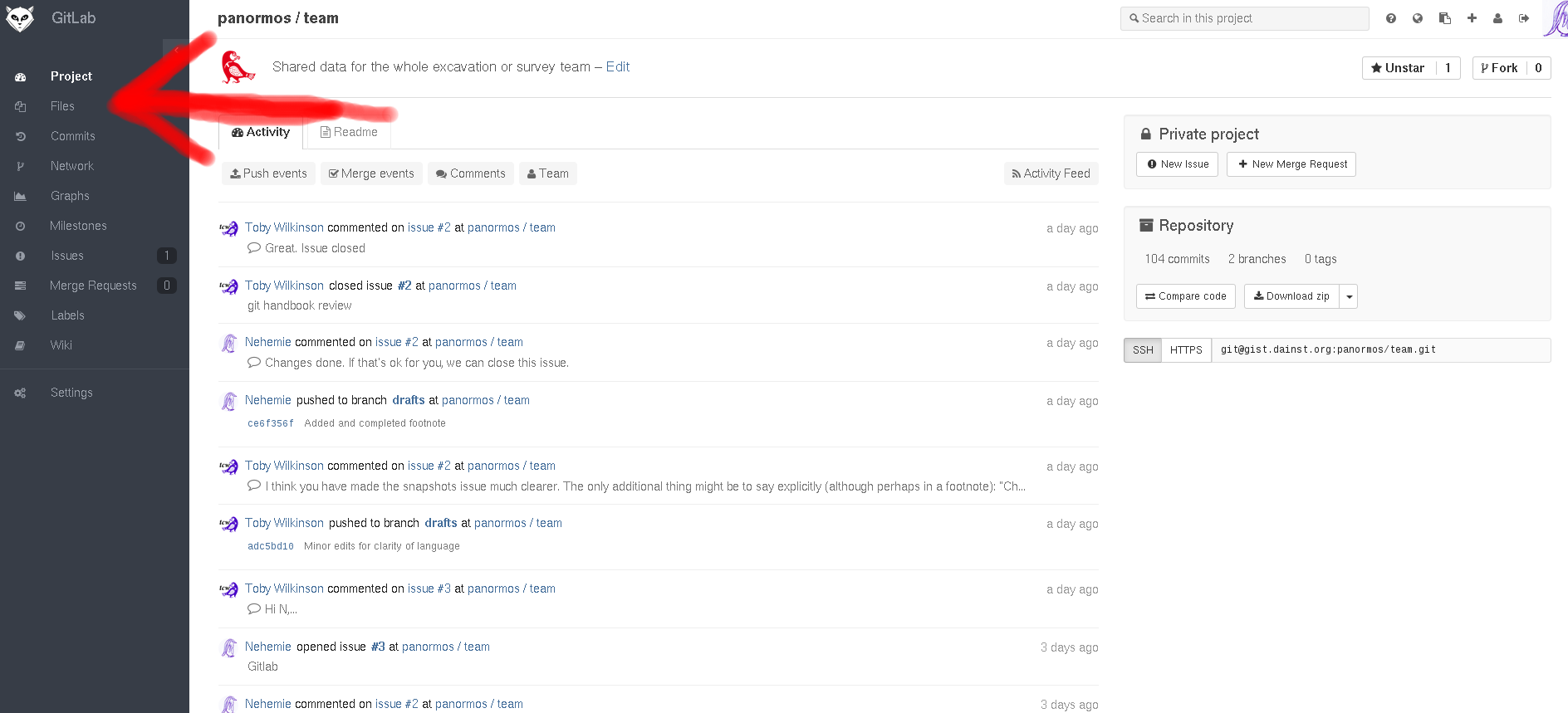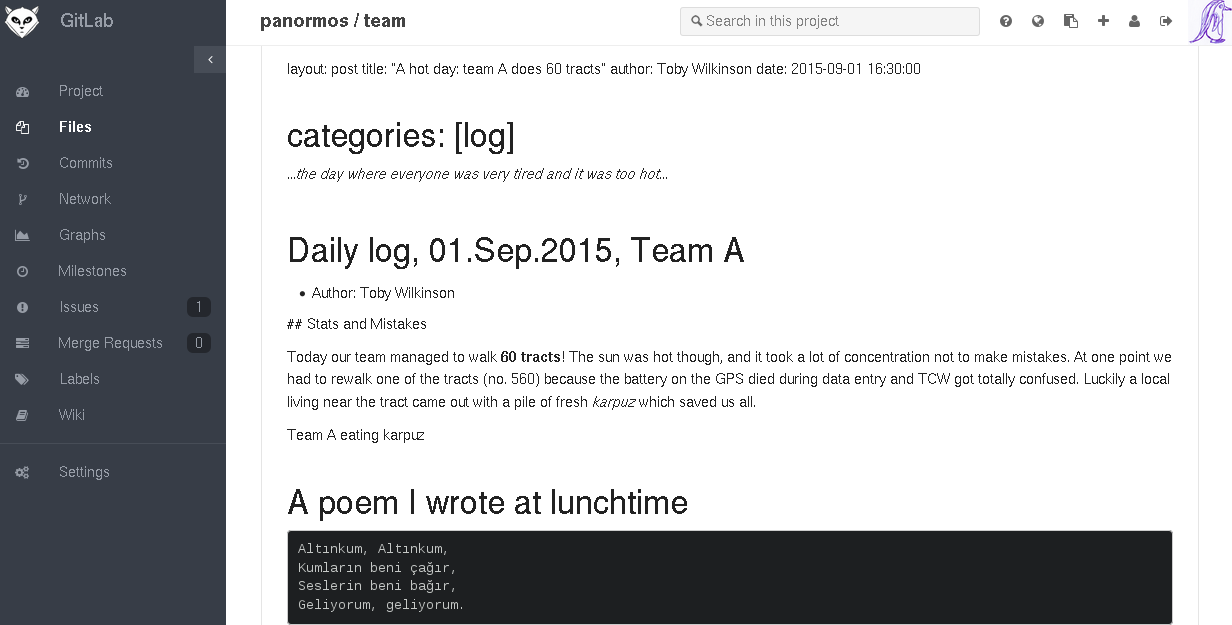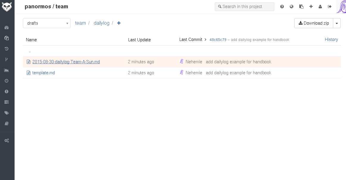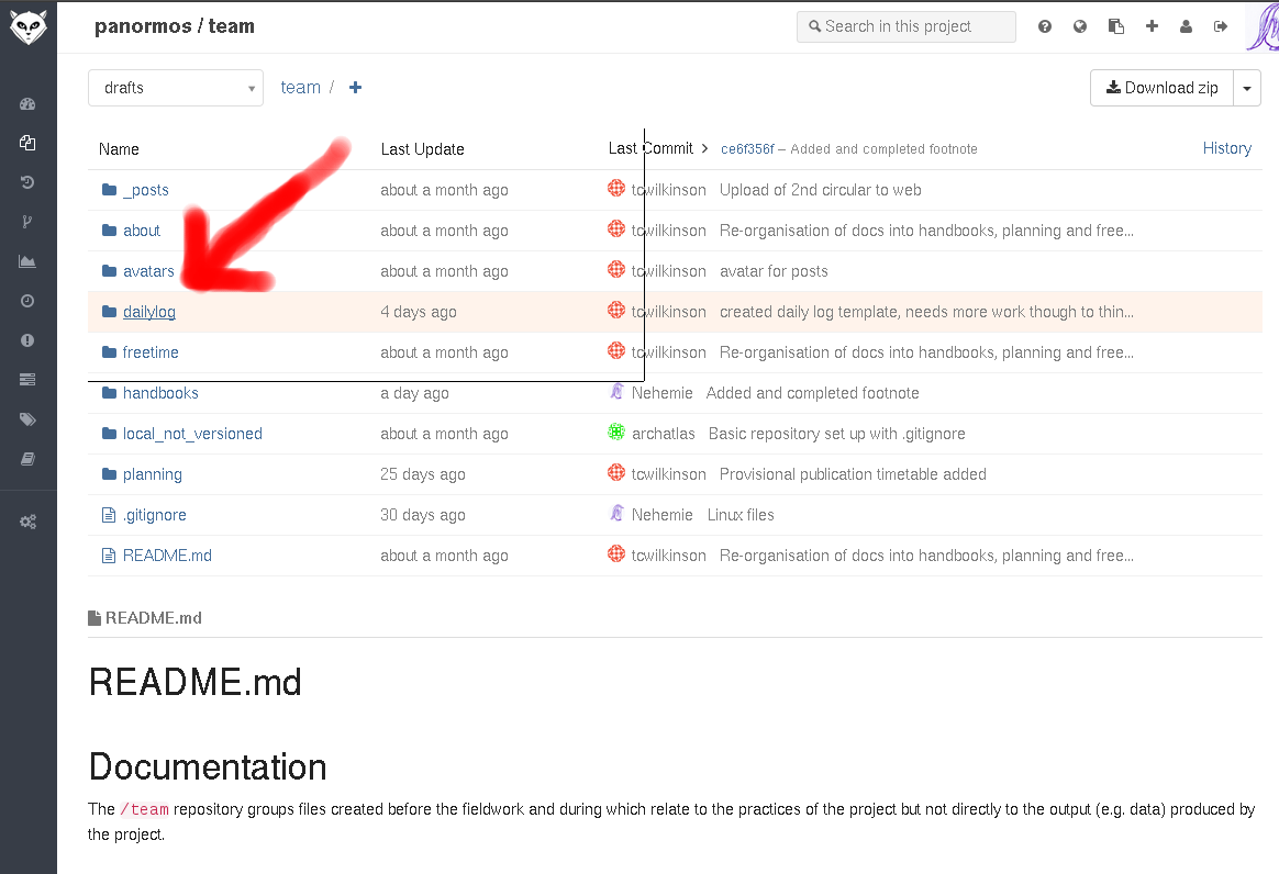 - On the right side, navigate to the project by clicking on “panormos/team” and after, on the left side of the panel click on “Files”. There you will find a folder named “dailylog”, click on it!