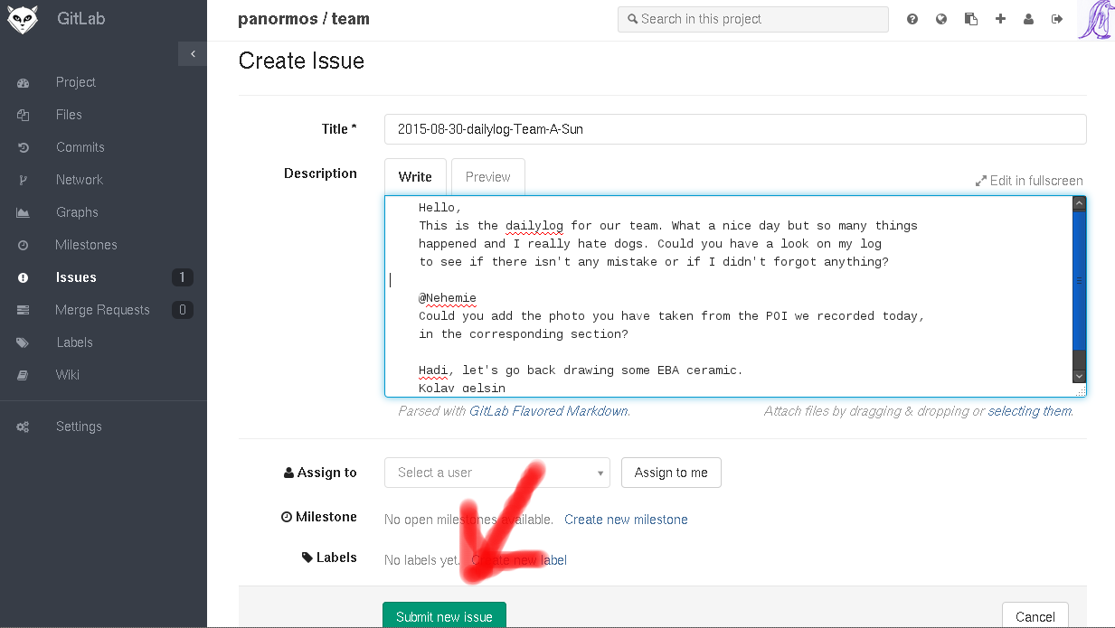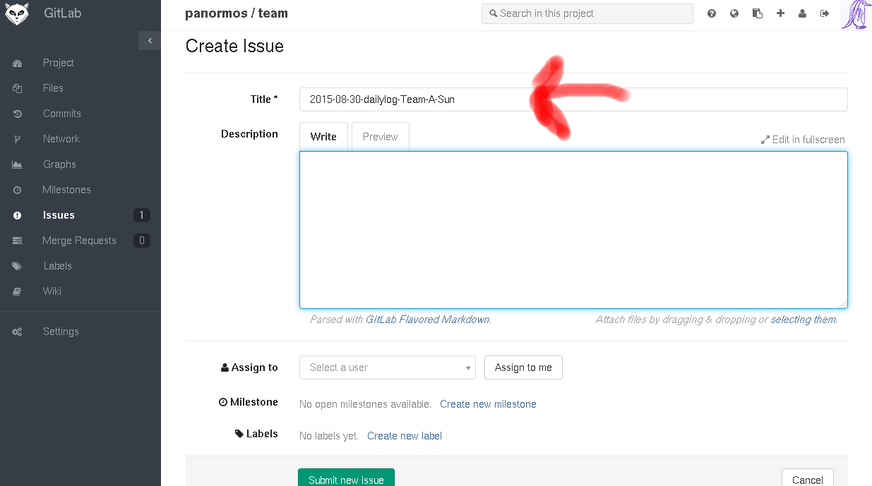 Open a new issue and fill the form. Add a title, for example, the name of the file you just edited (YYYY-MM-DD-dailylog-Team-X-Ddd).
